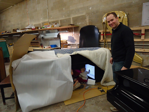 Always a gigging musician and local performing artist, Brigham lived at the piano day and night. Between his tuning appointments and with first son, baby Ben’s help, he rebuilt his first piano inside a tiny garage in 2002. As each new piano was completed, he would roll them out to the street to sell one by one.